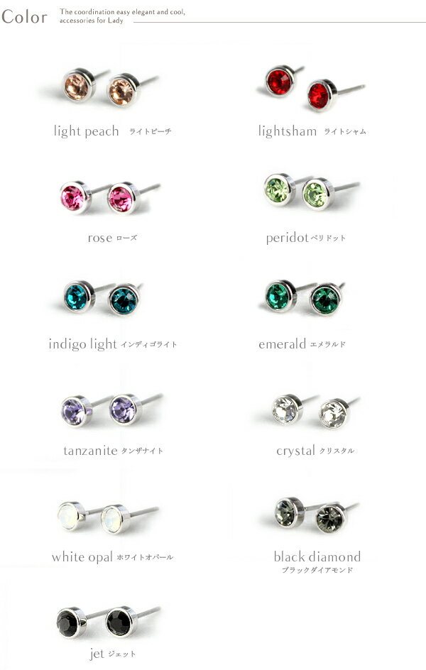 全11色▼ サイズ 直径約0.5cm 素材 スワロフスキー ポスト:チタン カラー ライトピーチ / ライトシャム / ローズ / ペリドット インディコライト / エメラルド / タンザナイト / クリスタル ホワイトオパール / ブラックダイアモンド / ジェット ネコポス対応 ネコポス配送の詳細はこちら→ 注意点 ※チタンは比較的金属アレルギーを起こしにくい素材とされていますが、すべての方にアレルギー反応がでない事(アレルギーフリー)を保証するものではございません。