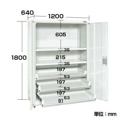商品について サイズ外寸 / 幅1200×奥行640×高さ1800mm棚板有効寸法 / 幅1095×奥行570mm 耐荷重棚板 / 1段当り 最大250kg(均等耐荷重)スライド棚 / 1段当り 最大70kg(均等耐荷重) 重量164kg 生産国日本 備考鍵付樹脂製アジャスター付(ネジ径:M12 P=1.75)※棚板は50mmピッチで段替え可能です。
